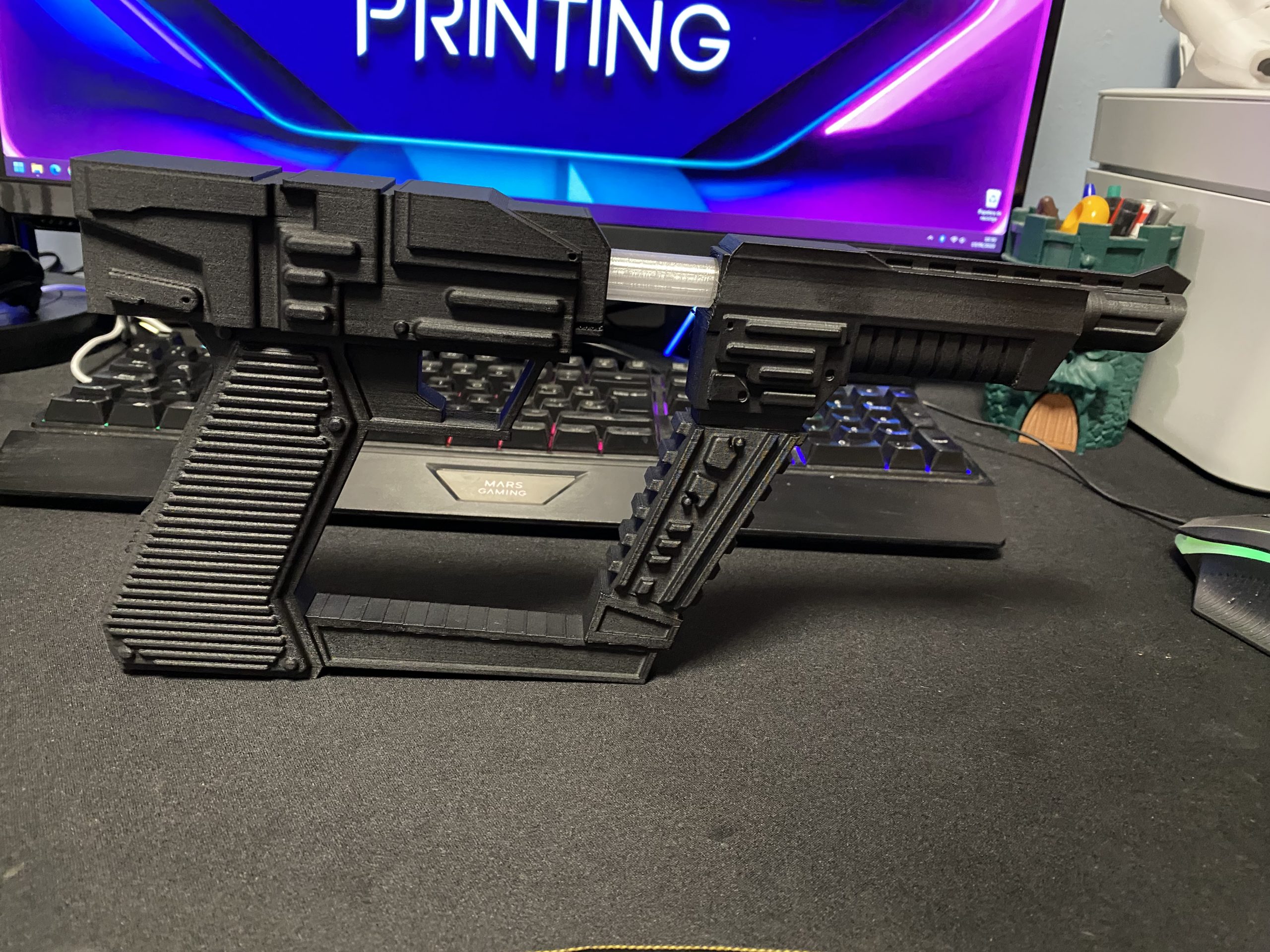 Pistola a escala de la famosa serie de V. Impresa en filamento PLA y pintada a mano en color negro.